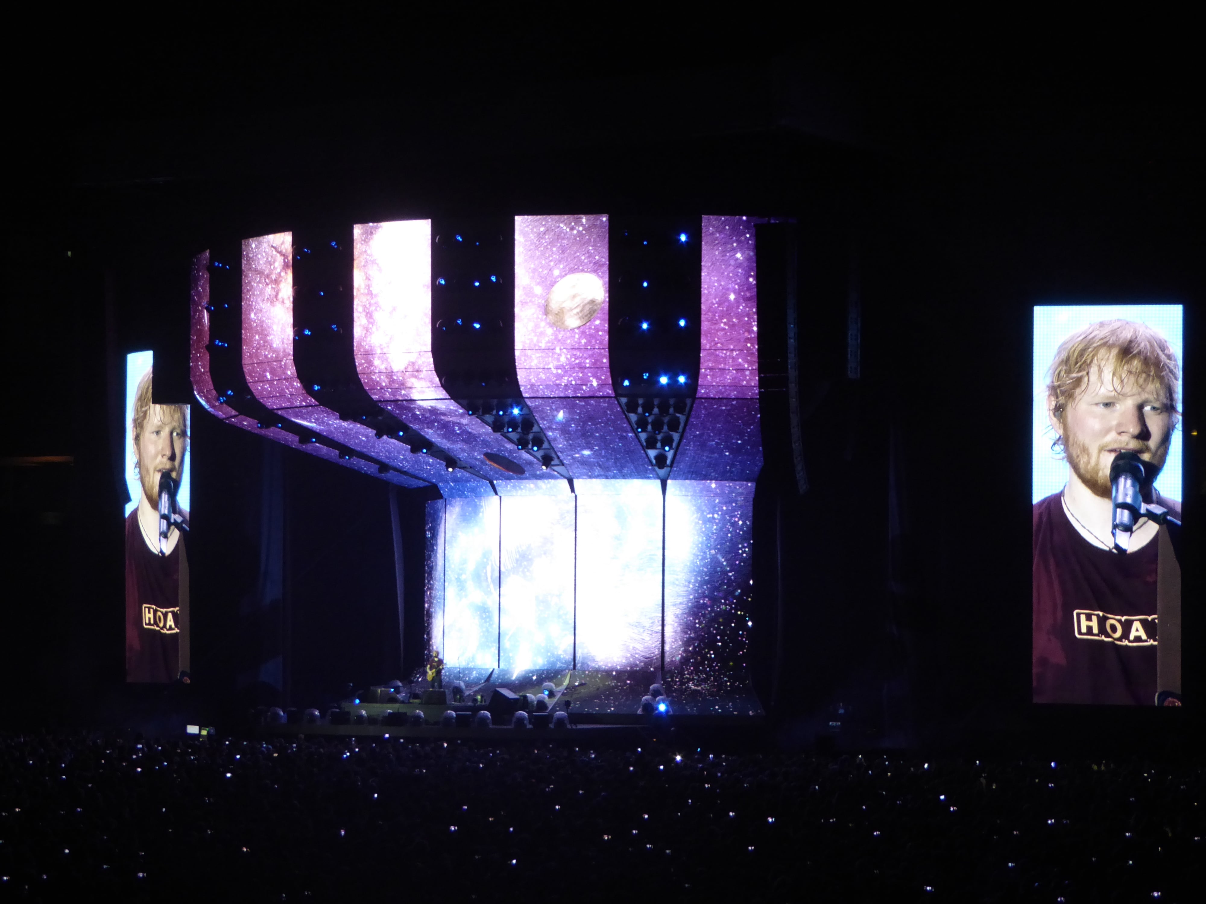 Normally you gotta wait a few songs to get the first big hit of the artist but what if this artist only has hits to play?! Ed Sheeran started with “Castle on the Hill” and with that he already got the crowd singing and clapping! The first song on his newest record Divide is “Eraser” which came next but before that Ed had to explain that everything we will hear tonight is “completely live” and comes out of this guitar and this loop station. It’s a shame that he has to explain this…