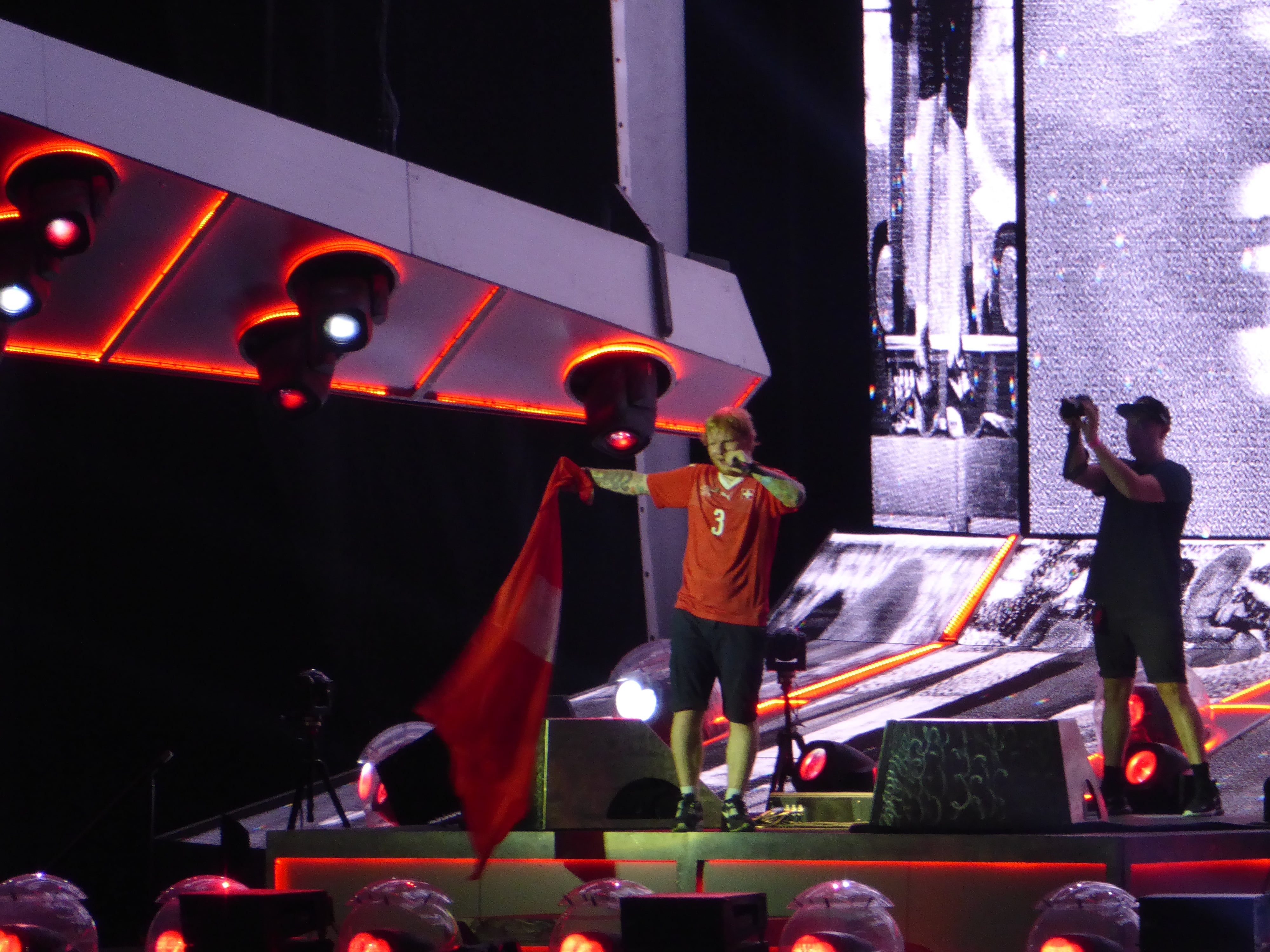 With the “Ohhhh Ohhh Ohh’s” of “Sing” Ed Sheeran went off the stage only to come back a few mins later to sing the 2 encore songs. But Ed wouldn’t be Ed if he didn’t have a surprise for us. He wore a Swiss Football Jersey with the No. 3 and Ed Sheeran on the back (Only on Night 1). This was greeted by loud cheer and the first three chords of His Uber Mega Hit “Shape of you” were enough to get the 100% dancing. I love the song and so does everyone else it seemed. He turned the stadium into a club. As always he finished the set with his longest song “You need Me, I don’t need you”. This song is the loudest and most intense song in his set which he always said he was building up to that. The poor guitar got beaten up pretty badly and Ed Sheeran started rapping and at the same time he was waving a Swiss flag. One of the many people I knew who went to the gigs said it was EDmazing and that word stuck with me.