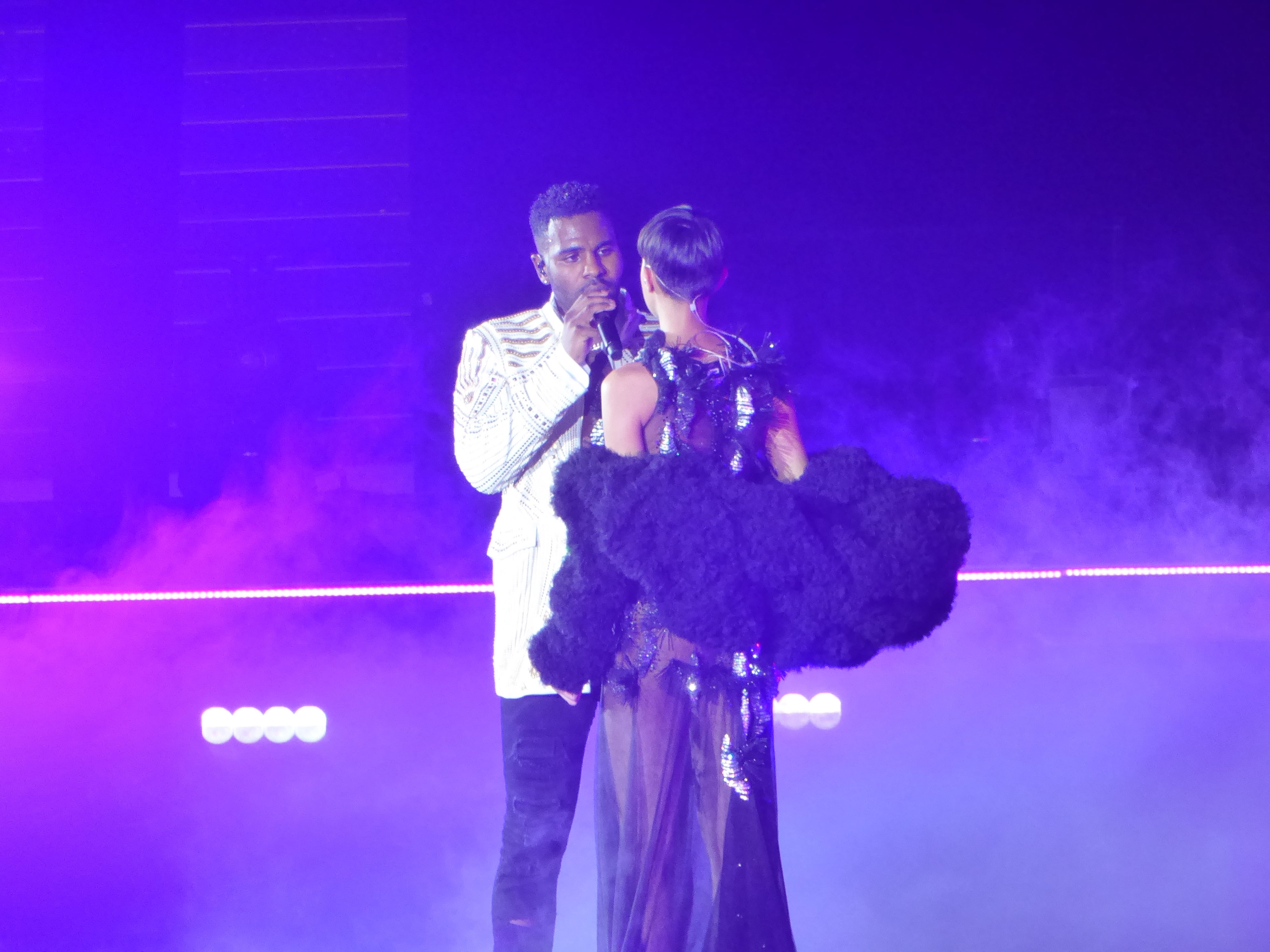 “In my Head”, “Get Ugly”, “Let me be the one” (Yes, he brought out the treadmills on stage for that and I cannot tell you how much I love that effect) and “Marry Me” followed. Of course lots of girls wished that Jason Derulo would asked that question to them LOL And the romantic atmosphere continued. Derulo asked his back ground singer who was in beautiful dress to join him up front. Together they sang the Little Mix duet “Secret Love Song”. And let me tell you wow her voice blew us away!
